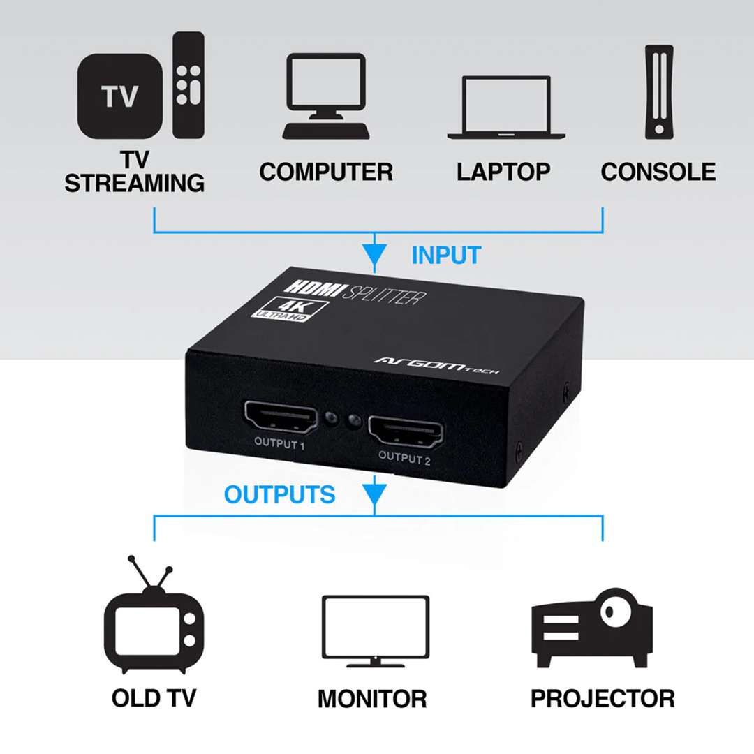 Expand your A/V experience with the Argom 2-Channel HDMI Splitter. Easily duplicate a single HDMI source — such as gaming consoles, computers, streaming devices, or other A/V players — to two displays, including monitors, TVs, or projectors. This splitter delivers a convenient, cost-efficient way to enjoy your content on multiple screens simultaneously.