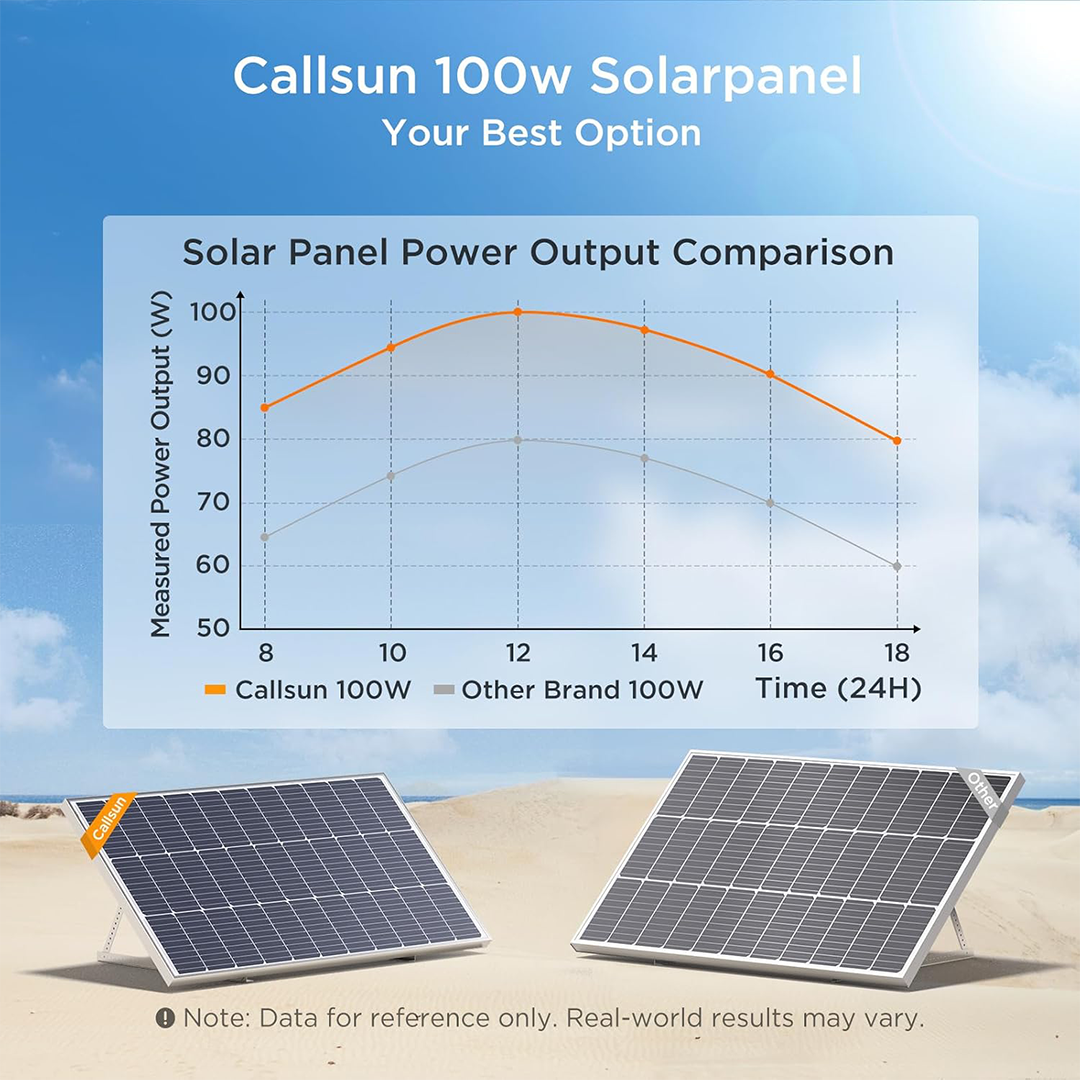 Get true 100W performance with Callsun’s high-output solar panels. Engineered for efficiency, each panel delivers up to 25% more energy than typical 100W panels, ensuring your RV, van, cabin, or off-grid setup has the power it needs.