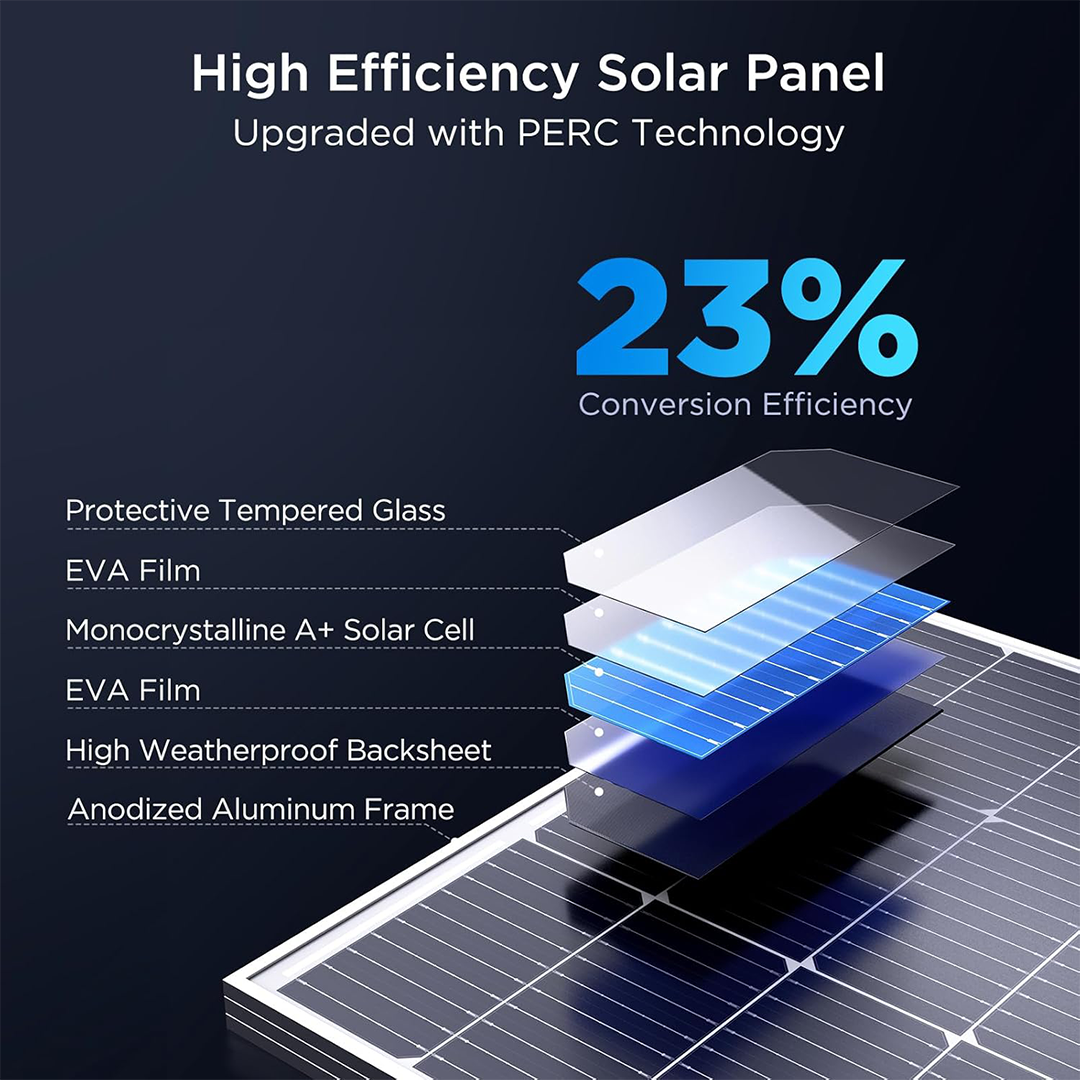 - Material: A+ Monocrystalline Silicon Cell, Anodized Aluminum Alloy Frame, Tempered Glass