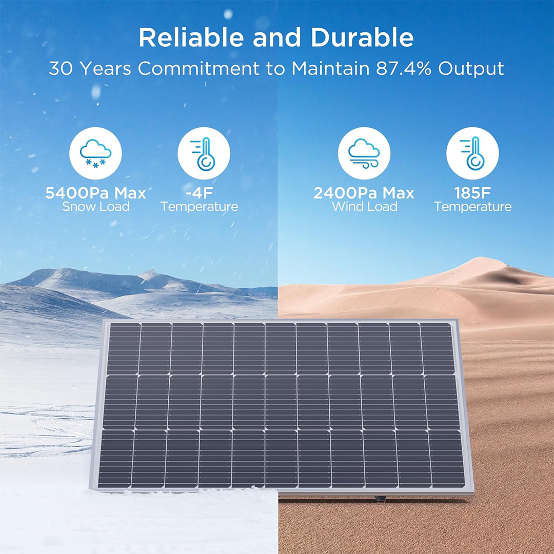 - Durable & Weather-Resistant: Low-iron tempered glass and corrosion-resistant aluminum frame. Rated IP67 waterproof, able to withstand rain, snow, and heat.