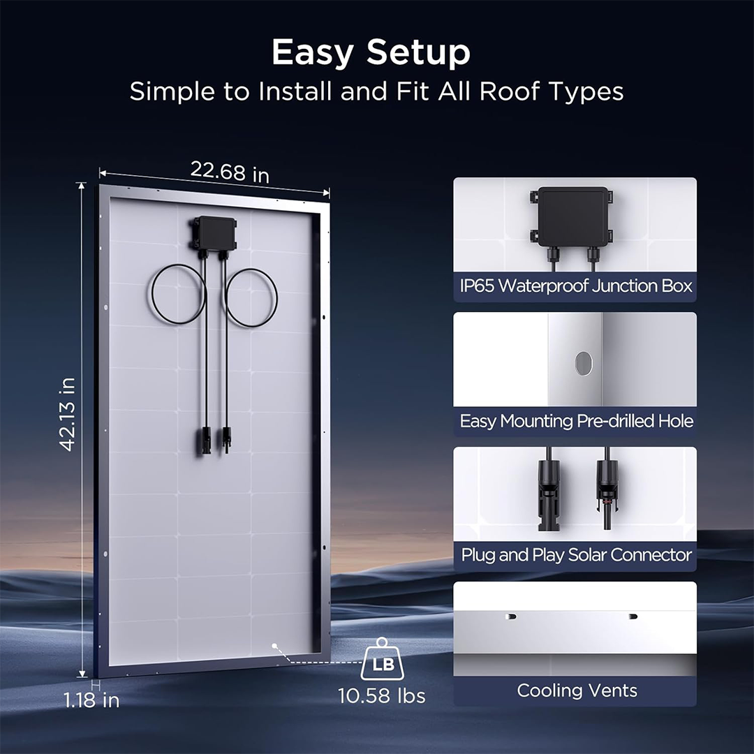 - Easy Installation: 42.13 × 22.68 × 1.18 inches, 10.58 lbs per panel, with 4 pre-drilled mounting holes. Compatible with most 12V solar systems.