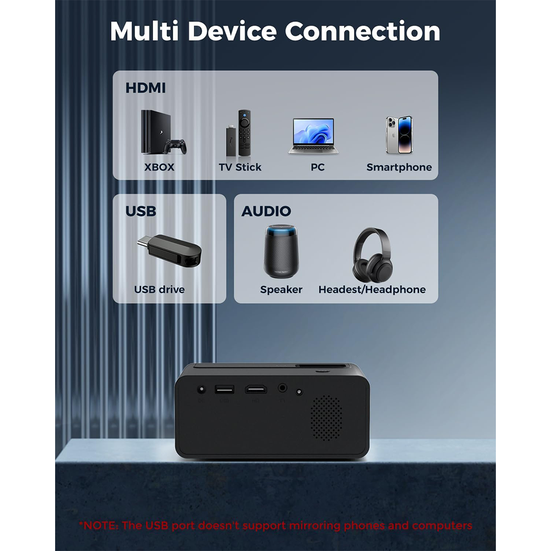 With HDMI, USB, and AV interfaces, the projector is compatible with iOS, Android, Windows devices, TV sticks, USB flash drives, and laptops. Built-in Hi-Fi stereo speakers deliver immersive sound, and the audio output port allows connection to headphones or external speakers. Its advanced cooling system reduces fan noise by 80%, providing a quieter viewing experience.