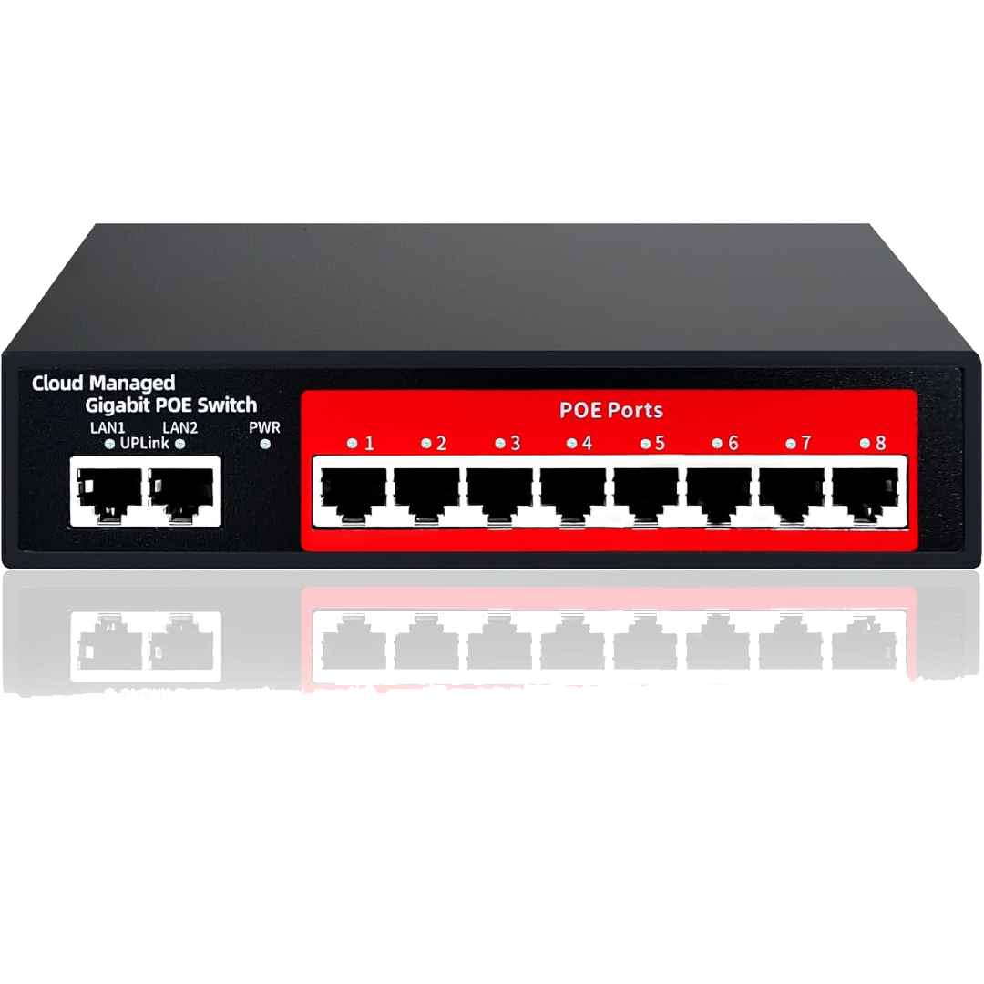 - Full Gigabit Managed PoE Switch: STEAMEMO gigabit PoE ethernet managed switch offers 10*10/100/1000 Mbps Base-TX RJ45 ports provide instant large file transfers, including 8 PoE ports which automatically identifies and powers PoE devices. Built-in power supply makes adapter no more needed, easier to use.