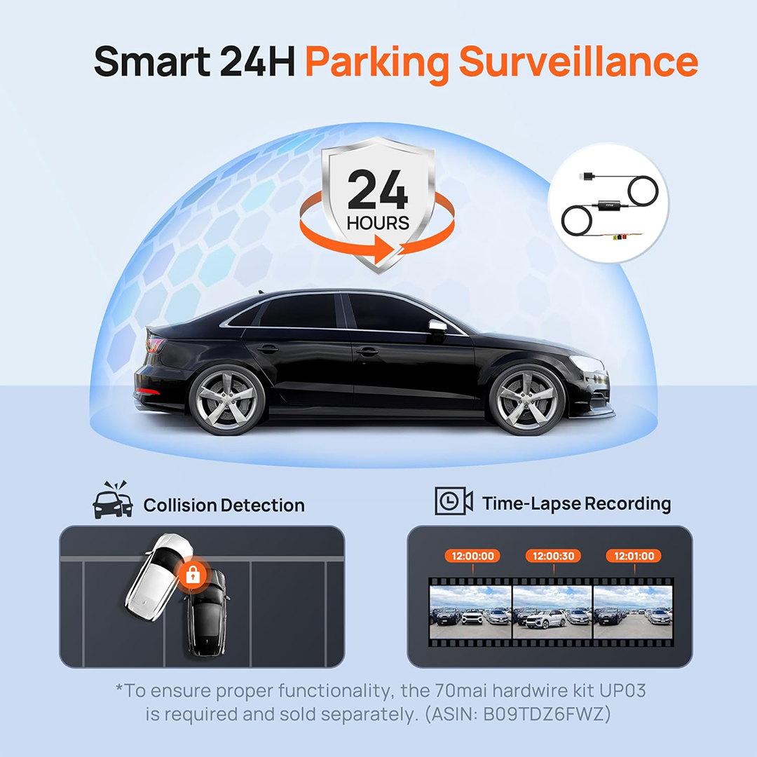 The included Hardwire Kit UP03 enables 24-hour parking monitoring, automatic ACC mode switching, and low voltage protection to safeguard your vehicle battery. Stay connected with built-in WiFi and manage your dash cam via the 70mai app on iOS or Android devices.